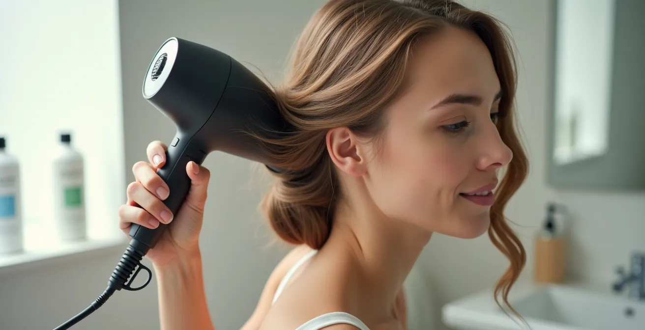 Genau hier kommt die oft übersehene Kaltluft- oder „Cool-Shot“-Taste ins Spiel. Ihre Funktion ist nicht nur, die Kopfhaut abzukühlen. Nachdem eine Strähne mit heißer Luft in Form gebracht wurde, fixiert ein kurzer Stoß kalter Luft diese Form sofort. Wissenschaftliche Studien belegen, dass 100% der Wasserstoffbrückenbindungen durch Kaltluft fixiert werden. Dieser Schritt „versiegelt“ das Volumen und macht die Frisur um ein Vielfaches haltbarer.